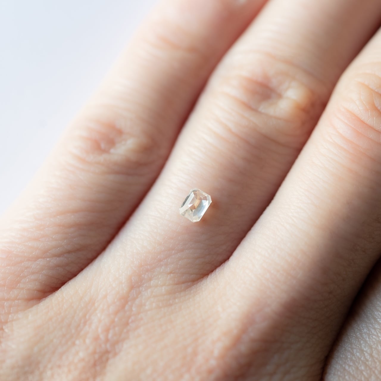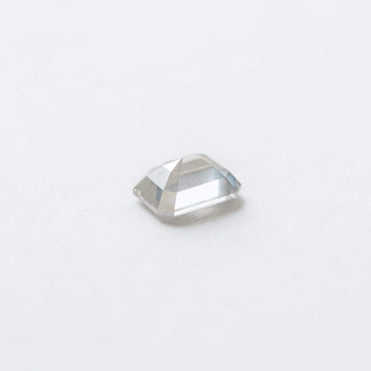 静かに光を溜め込んだ湖は、どこまでも透き通っています。小柄なサイズ感ながらも、時折薄水色に見える繊細な色彩が特徴的なダイヤモンド。階段状に施された丁寧なカットが無垢な輝きを肌の上へ届けます。上品な印象を与えてくれる佇まいです。